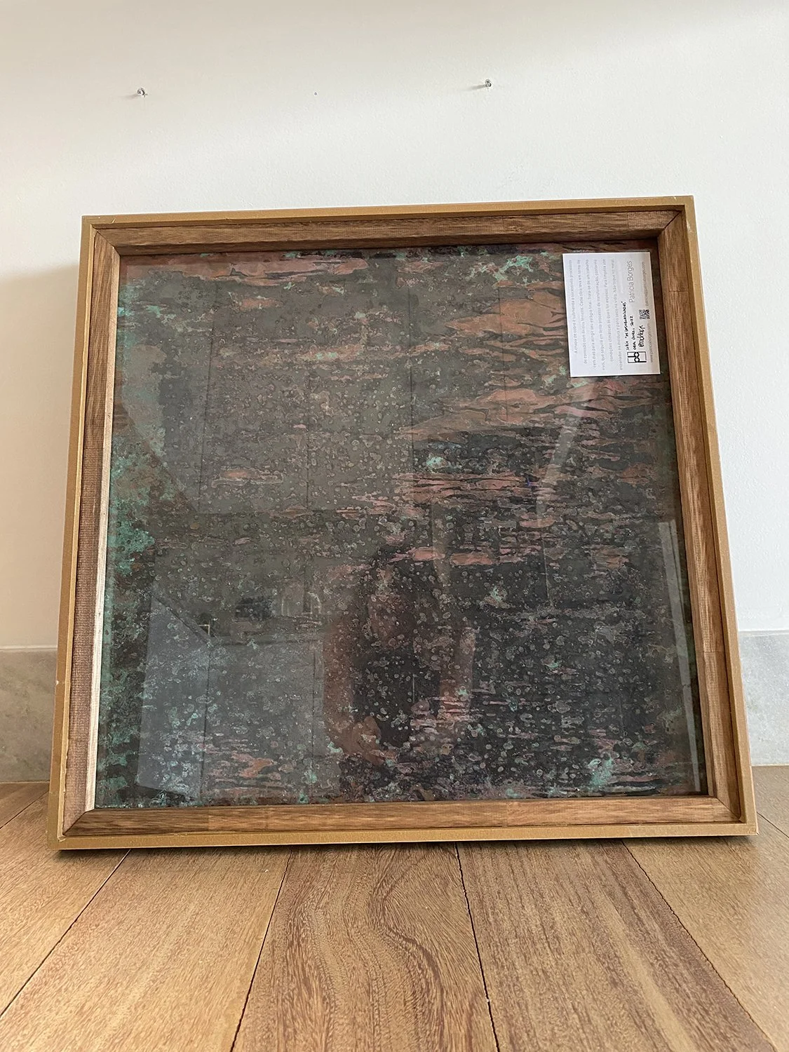 [[Copper and tin foils on natural wood boxes, with glass on the back///Chapas de cobre ou latão em caixa de madeira natural com fundo em vidro]]