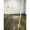Em IF/THEN [welcome], os processos materiais interrompem essa certeza. Látex natural, colágeno de peixe, conchas e sementes resistem à ordem algorítmica: à revelia da pele de vidro, amolecem, derretem, transbordam, pingam e se desfazem sob o peso da umidade e do tempo. A obra responde ao ambiente: a ausência de luz natural, o ar úmido e parado, o isolamento do lugar — e se torna registro de uma transformação lenta. Nos oferece uma imagem instável, sem começo nem fim, uma presença sempre provisória.