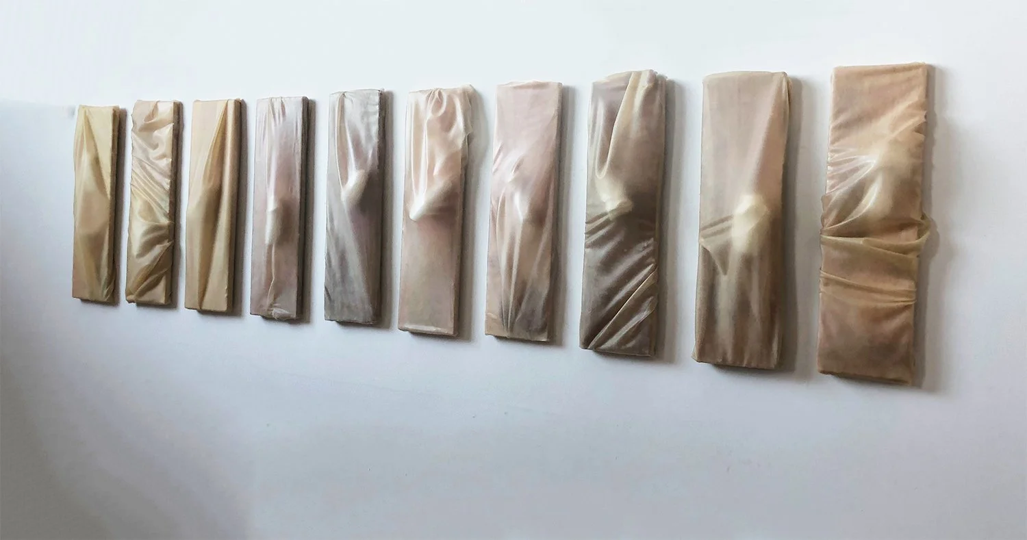 [[To continue my latex experiments, after the performance DISAPPEARING ACT NUMBER 1 (2020) and two photo series DISAPPEARING ACT (2020) and TAKE YOUR PILLS (2021), building wall objects seemed a natural development. An inner life started to grow underneath, to fight with this skin of contention.