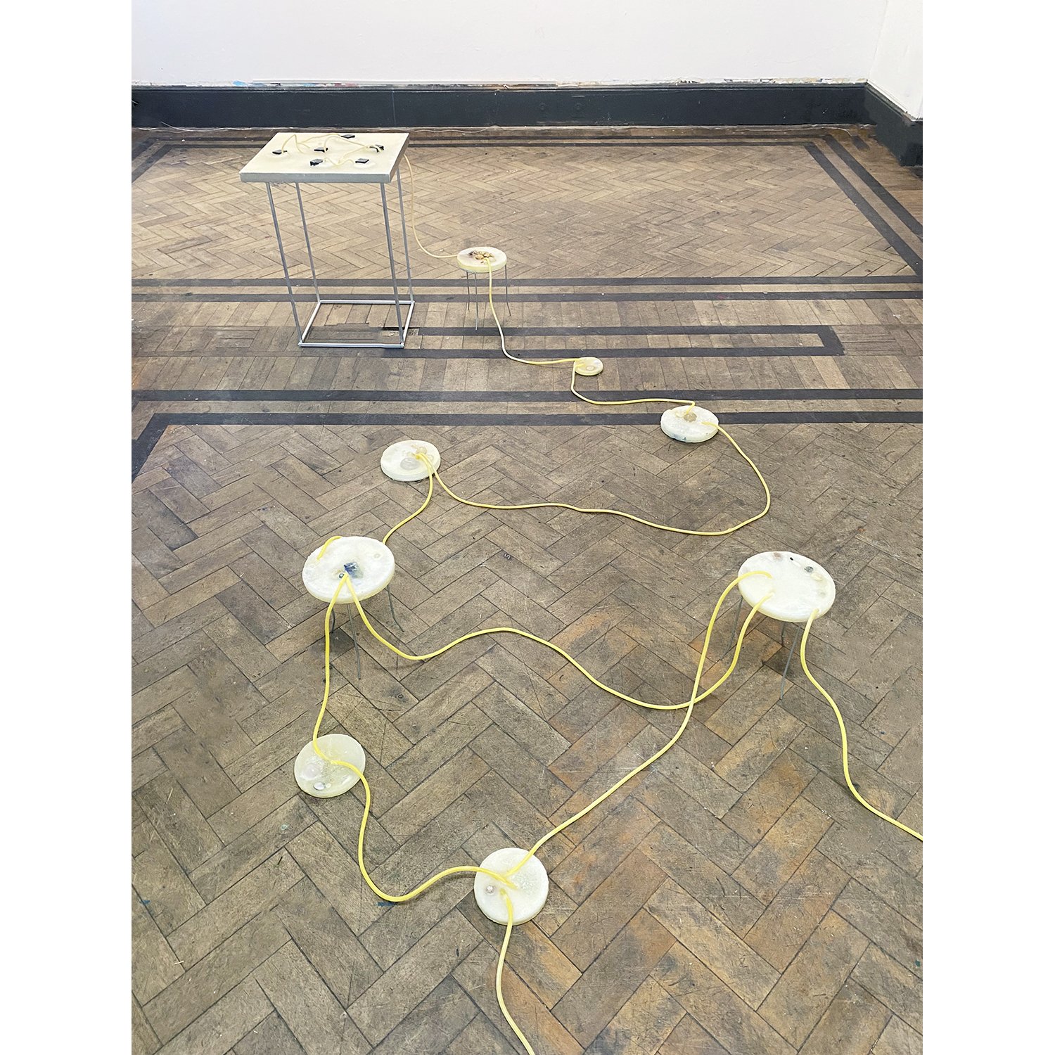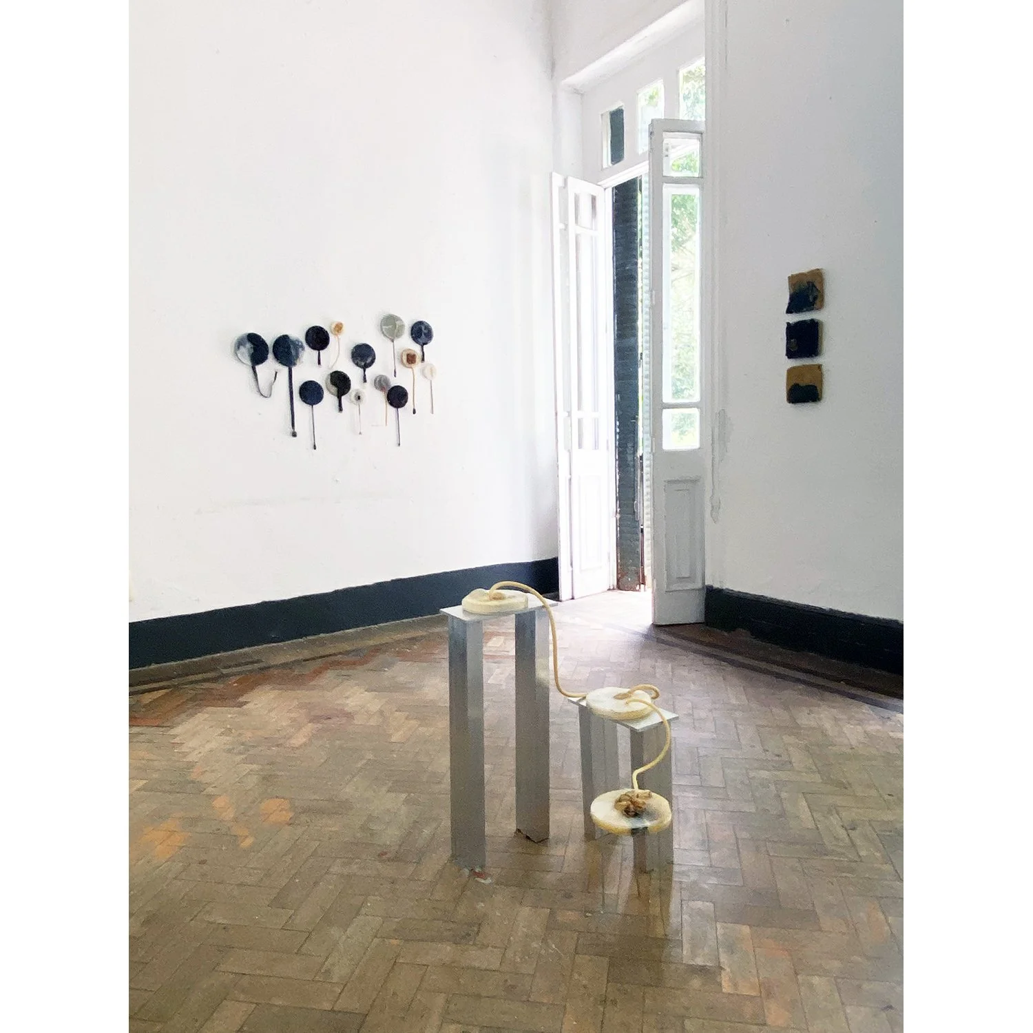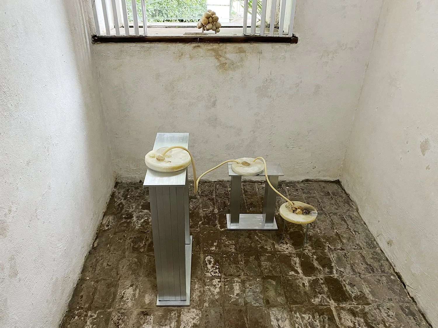 [[A work of transitory nature, sensitive to its environment. In humidity, magnesium sulfate dissolves, forming water droplets; the rosin becomes sticky, trapping dust; the latex loses elasticity, tearing and revealing the seeds inside. Under UV light, the paraffin and wax turn yellow, the rosin fragments, and the latex becomes brittle.///Obra de caráter transitório, sensível ao ambiente. Com a umidade o sulfato de magnésio dissolve-se formando gotas de água, o breu fica pegajoso fixando poeira, o látex perde a elasticidade rompendo-se e expondo as sementes em seu interior. Sob ação da luz UV a parafina e a cera amarelam, o breu fragmenta-se, o látex torna-se quebradiço.]]